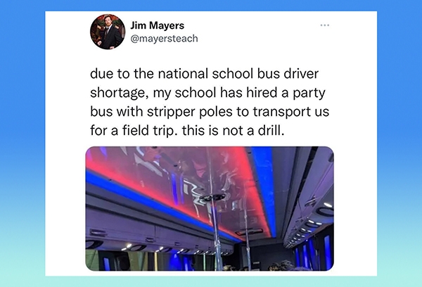 “It is a funny story, but there actually is a real bus shortage, and it speaks to major flaws in our education system,” he said in another tweet while confirming that the field trip was a success. Mayers’ original recently deleted tweet went viral, and many found it hilarious to see these students get from point A to B through a stripper bus. That said, he is now using the attention received from the initial tweet to shine a light on the educational inequities and other issues that the country’s schools are facing on a day-to-day basis.